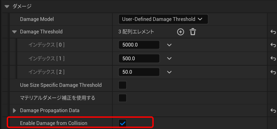 具体的には Enable Damage from Collision が有効になっている状態で、 Damage Threshold を破壊できるようように調整します。