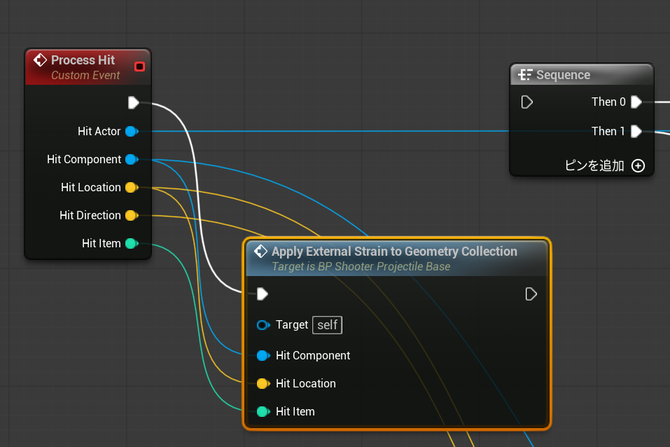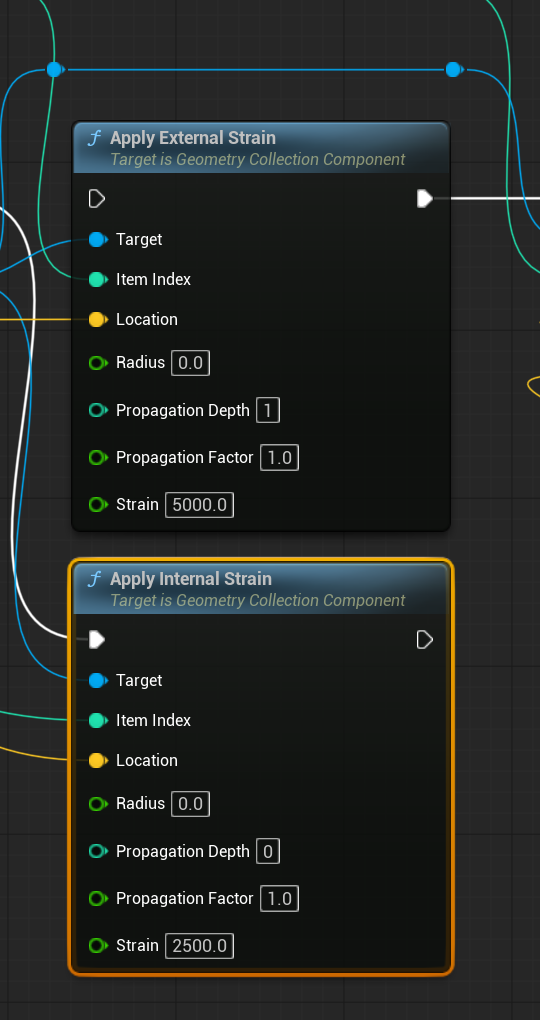 - `Strain` の `5000` は `Damage Threshold` に合わせていますが、`Geometry Collection` の `Enable Damage from Collision` が有効になっている場合にはそれより小さくても破壊できます。 - `Apply Linear Velocity` は `Apply External Strain` での破壊後に破片を吹き飛ばす力を与えるためです。Process Hit に接続する