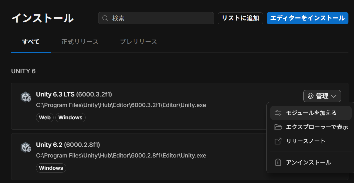 - プロジェクトを Unity Hub からディスクから追加で開く