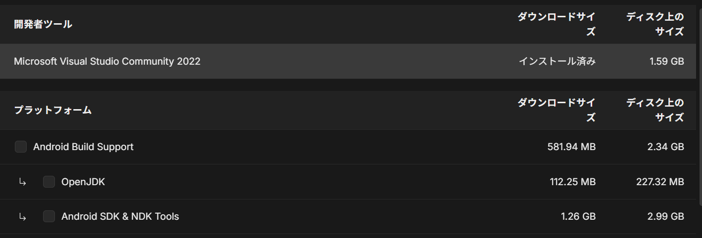 - Android Build Support が無い場合は、Unity Hub からインストールする
