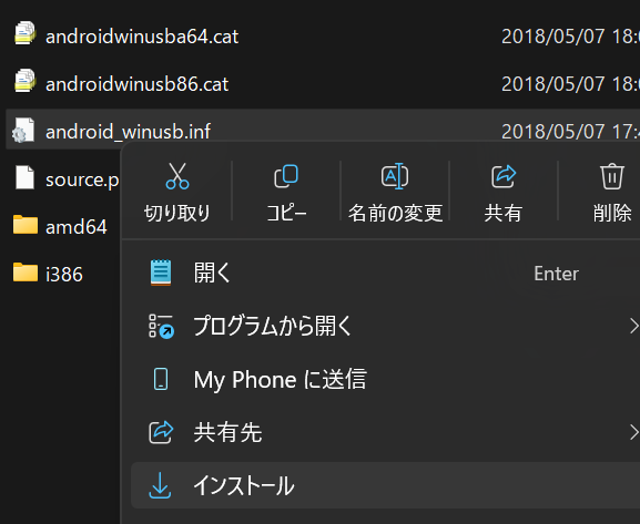 .infのファイルを右クリックでインストールする