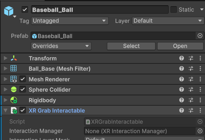 XR Grab Interactableコンポーネントを追加。- Prefab が更新されないように unpack してからでもいいかも。