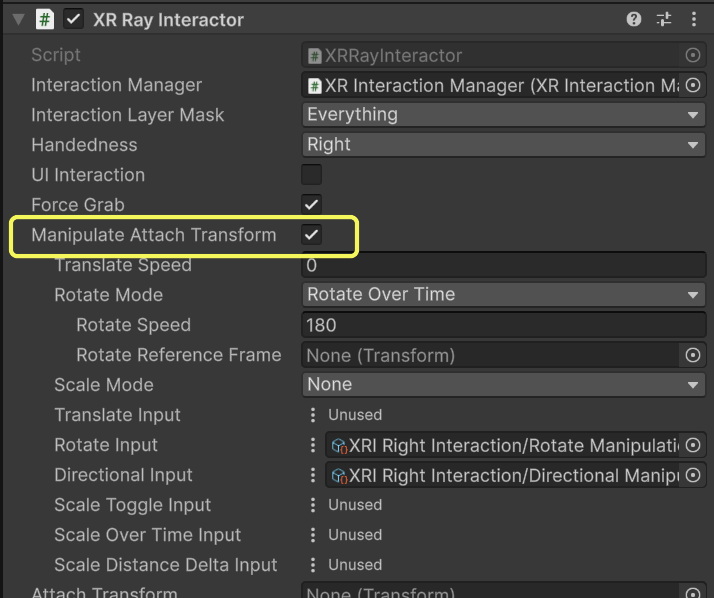 XR Ray Interactor の Manipulate Attach Transform を disable にする