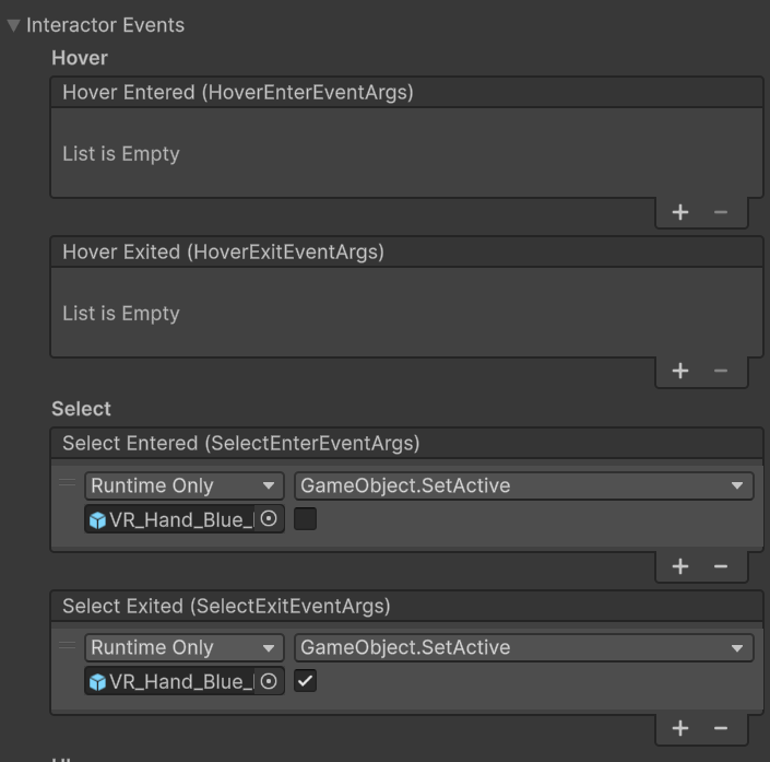 XR Ray Interactor の Select イベントで手のモデルを消す