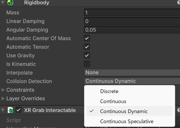 Collision DetectionをContenious Dynmic - XR Grab Interactable の Smooth Position/Rotation を有効化