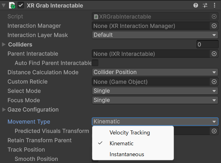 - ⚠️ XR Grab Interactable の Movement Type は Kinemtatic にしない