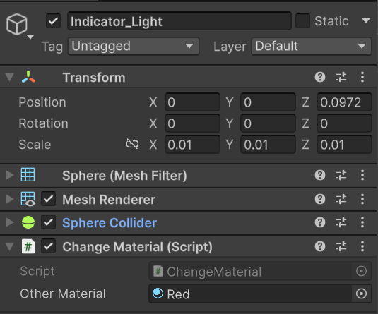 Indicator_Light (リモコンの赤外線ライト) に Change Material スクリプトをアタッチ