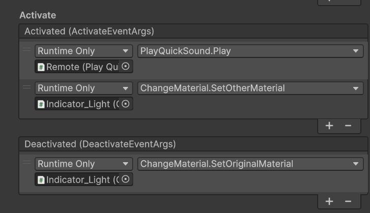 Remote の方の Activate イベントに Indicator_Light のマテリアル変更関数をセット